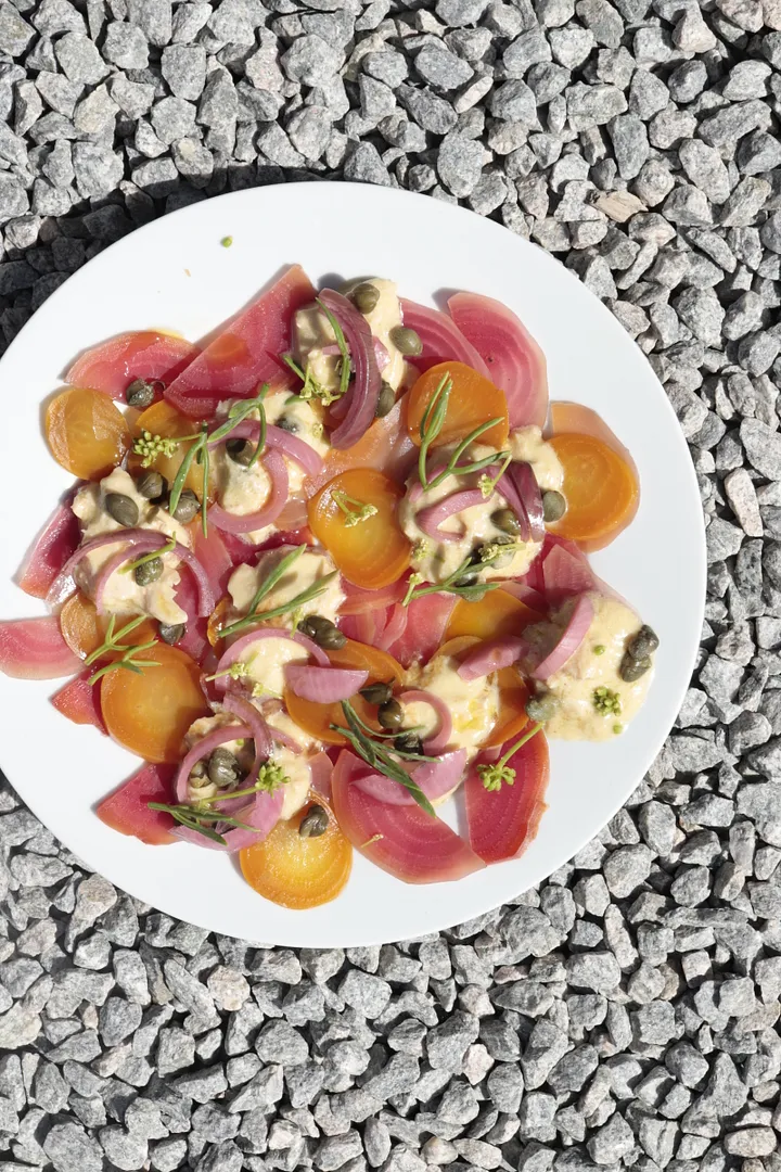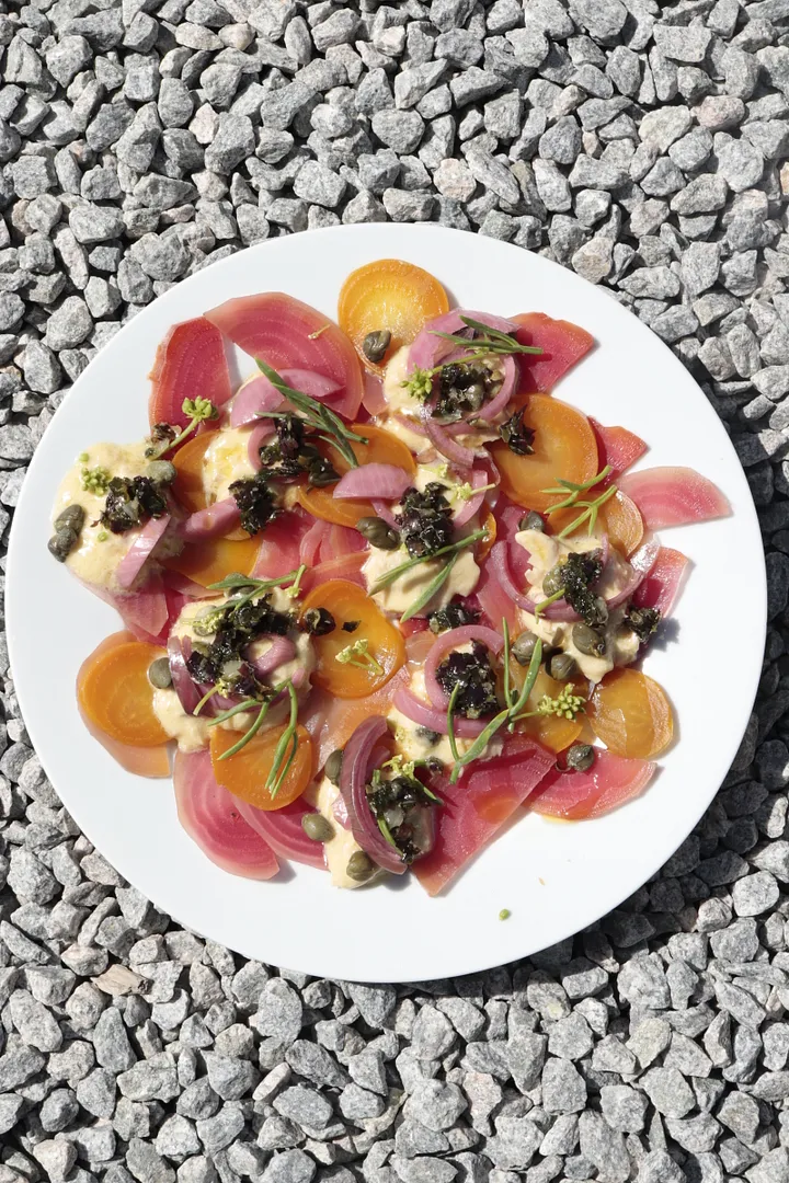 Disposez les tranches de betterave dans un plat de présentation, ajoutez des cuillères de sauce “tonnato”, des pickles de moutarde, une petite cuillère de tartare d’algue sur chaque cuillère de sauce, arroisez d’un filet d’huile d’olive et dégustez en entrée.