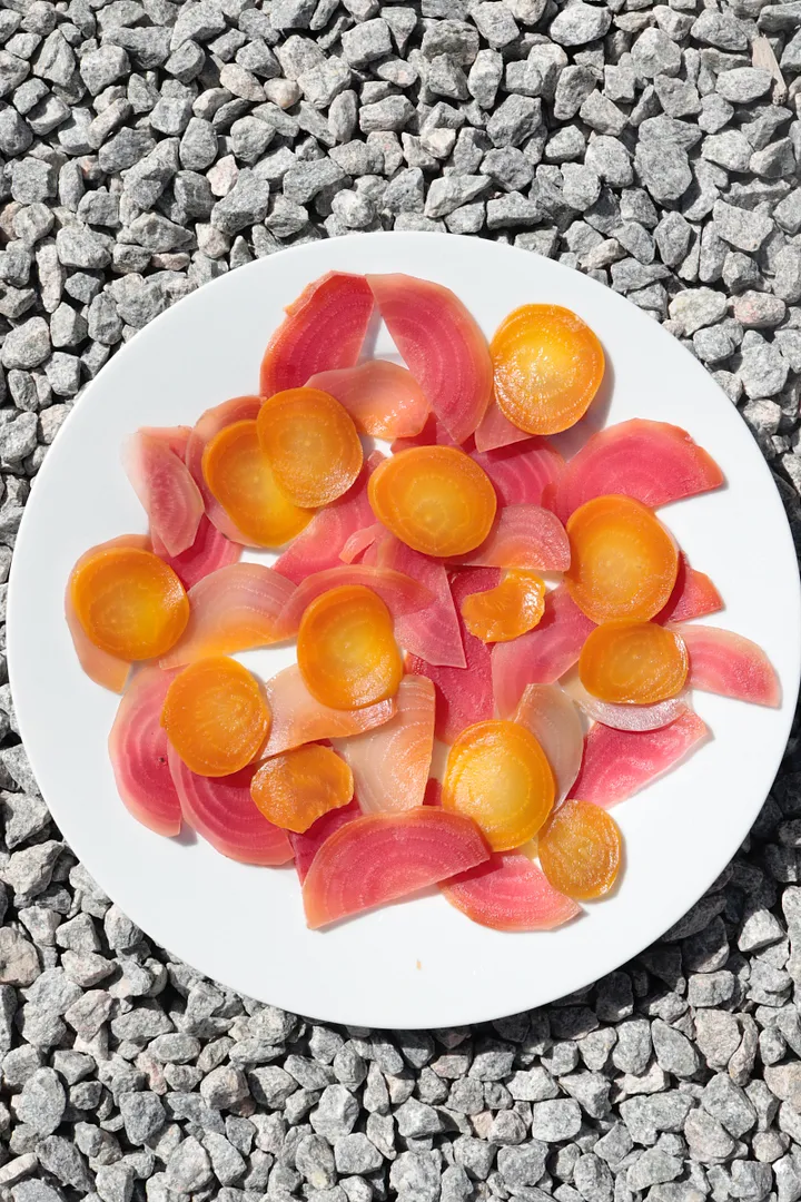 Pelez les betteraves, la peau se décolle facilement toute seule, tranchez-les à la finesse que vous souhaitez.