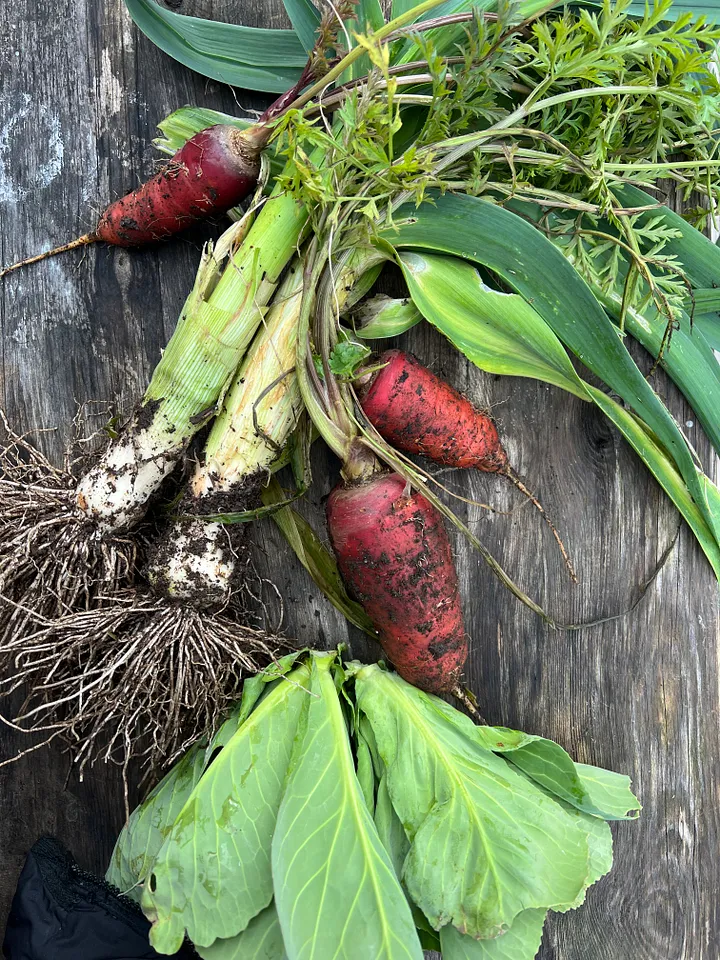 Ce matin je voulais cuisiner une soupe nourrissante, une de ces soupes qui font chaud au cœur et à l’âme. Mon frigo est presque vide (c’est suffisamment rare pour le noter) et je suis allée dans mon potager. Comment l’oublier ? J’y ai quelques légumes d’hiver : poireaux, choux, carottes, betteraves, roquette, mâche, radis…J’imagine que ce serait la soupe qui cuit des heures dans june marmite suspendue au dessus du feu de cheminée -mon rêve- et qui prend le temps de développer tous les arômes des légumes. Une soupe réconfortante, d’hiver avec une petit ingrédient secret.
