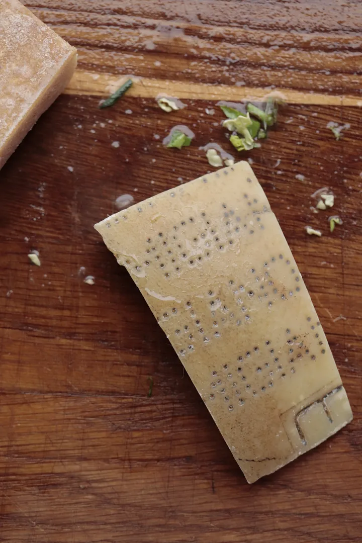 2/ La croûte de parmesan : c’est ce qui va apporter le “umami” à votre soupe, ce côté salé, cette profondeur en goût.